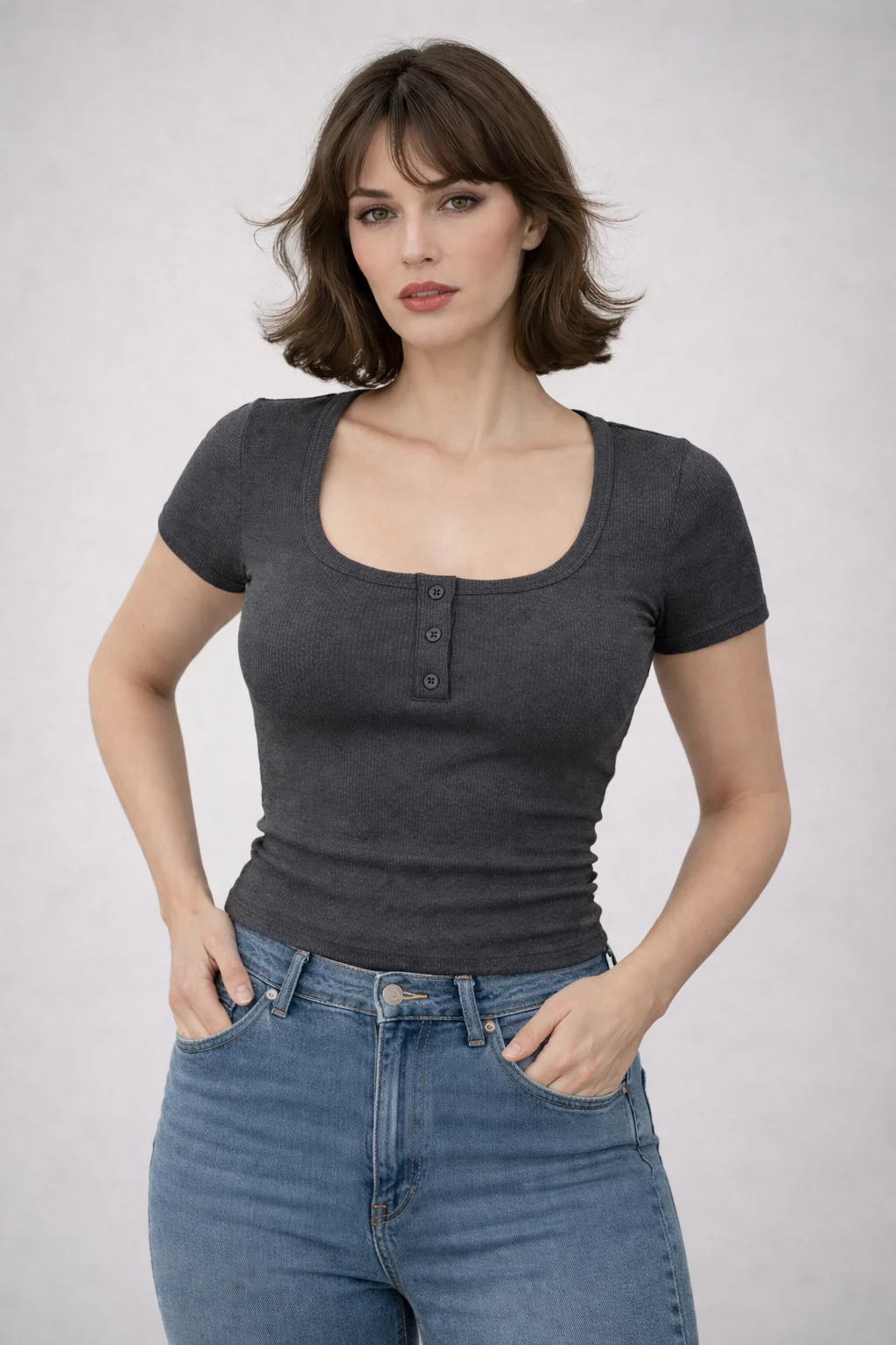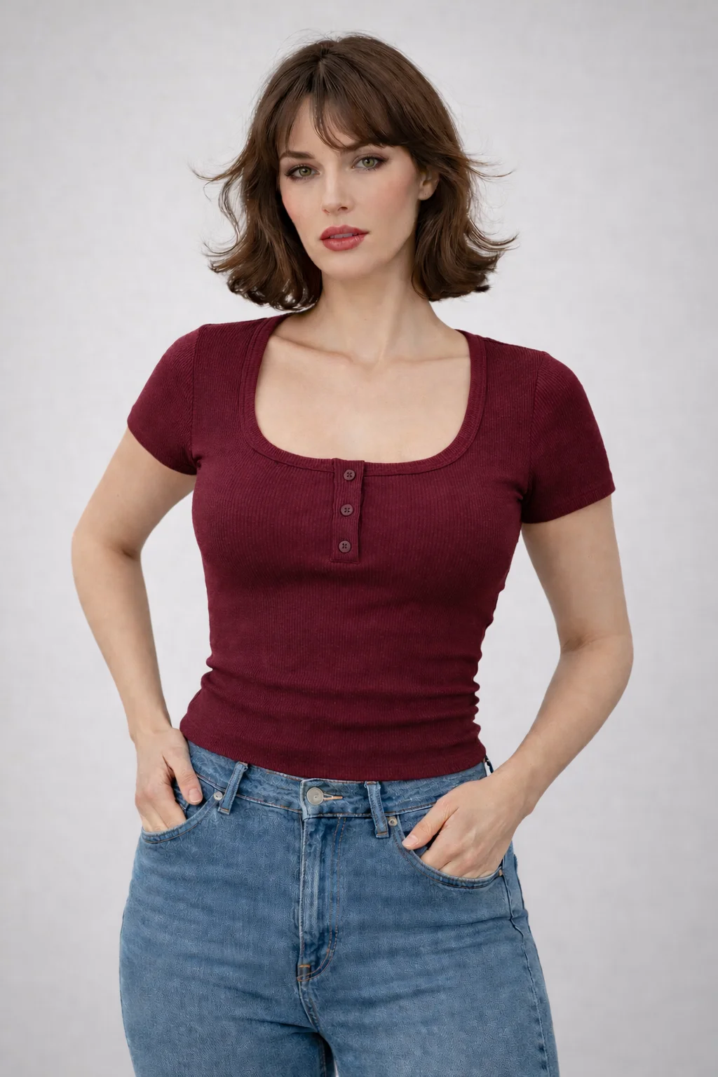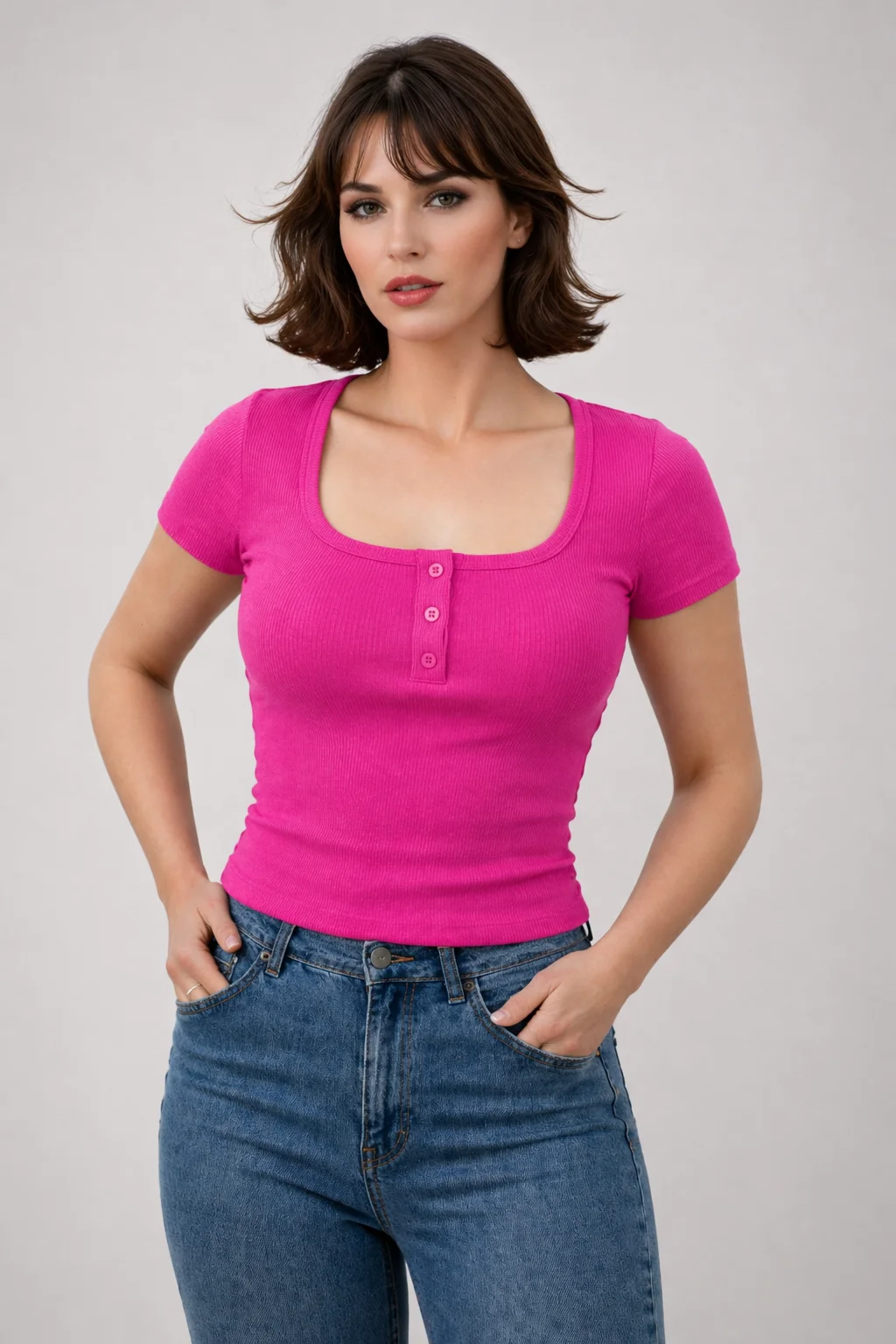 التصميم Slim Fit بيبرز شكل الجسم بشكل جذاب، مع ياقة مربعة وأزرار أمامية بتدي لمسة شيك وعصرية. التيشيرت مناسب للخروج اليومي، الجامعة، الشغل أو حتى لوك كاجوال ستايل.