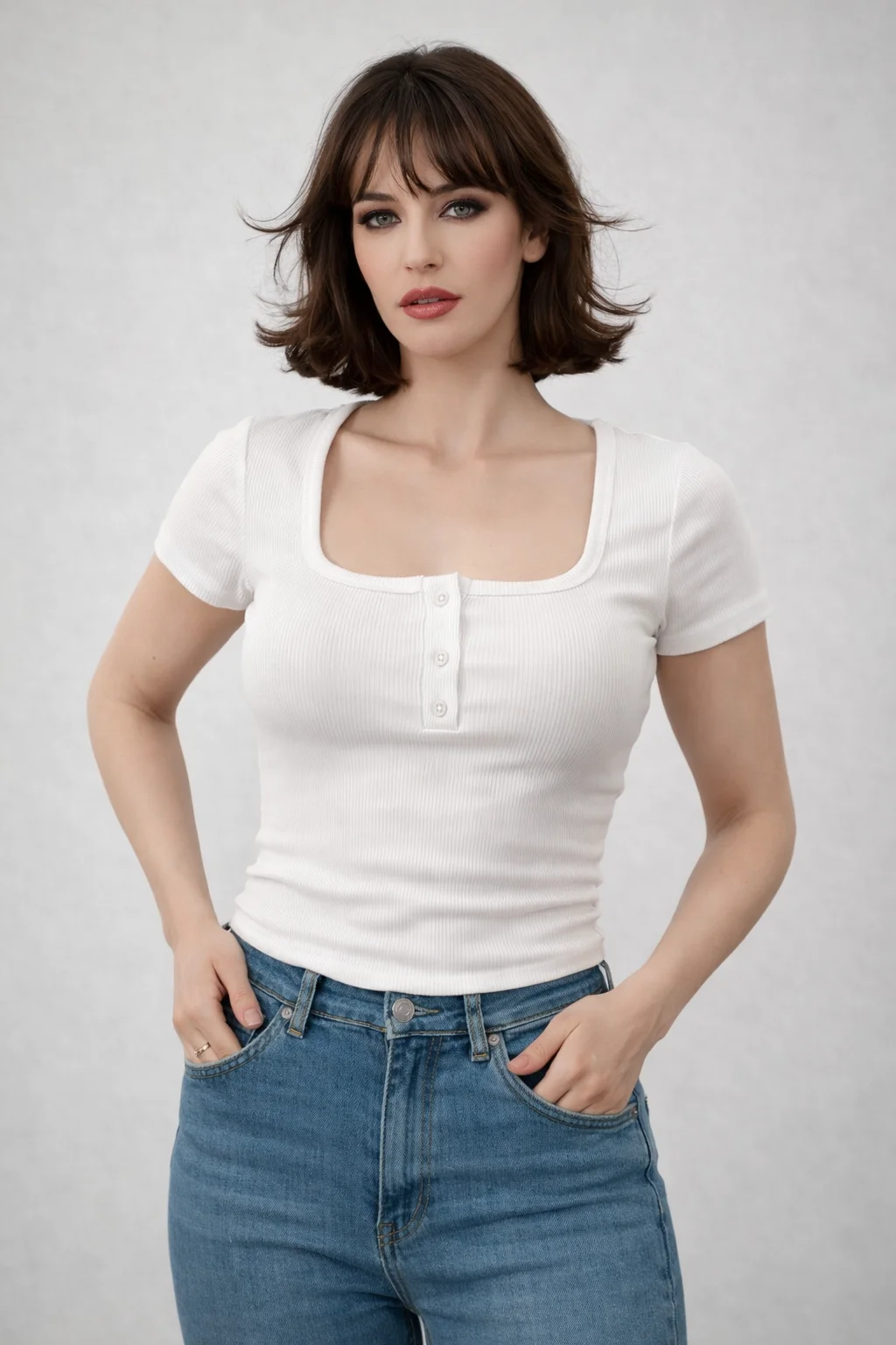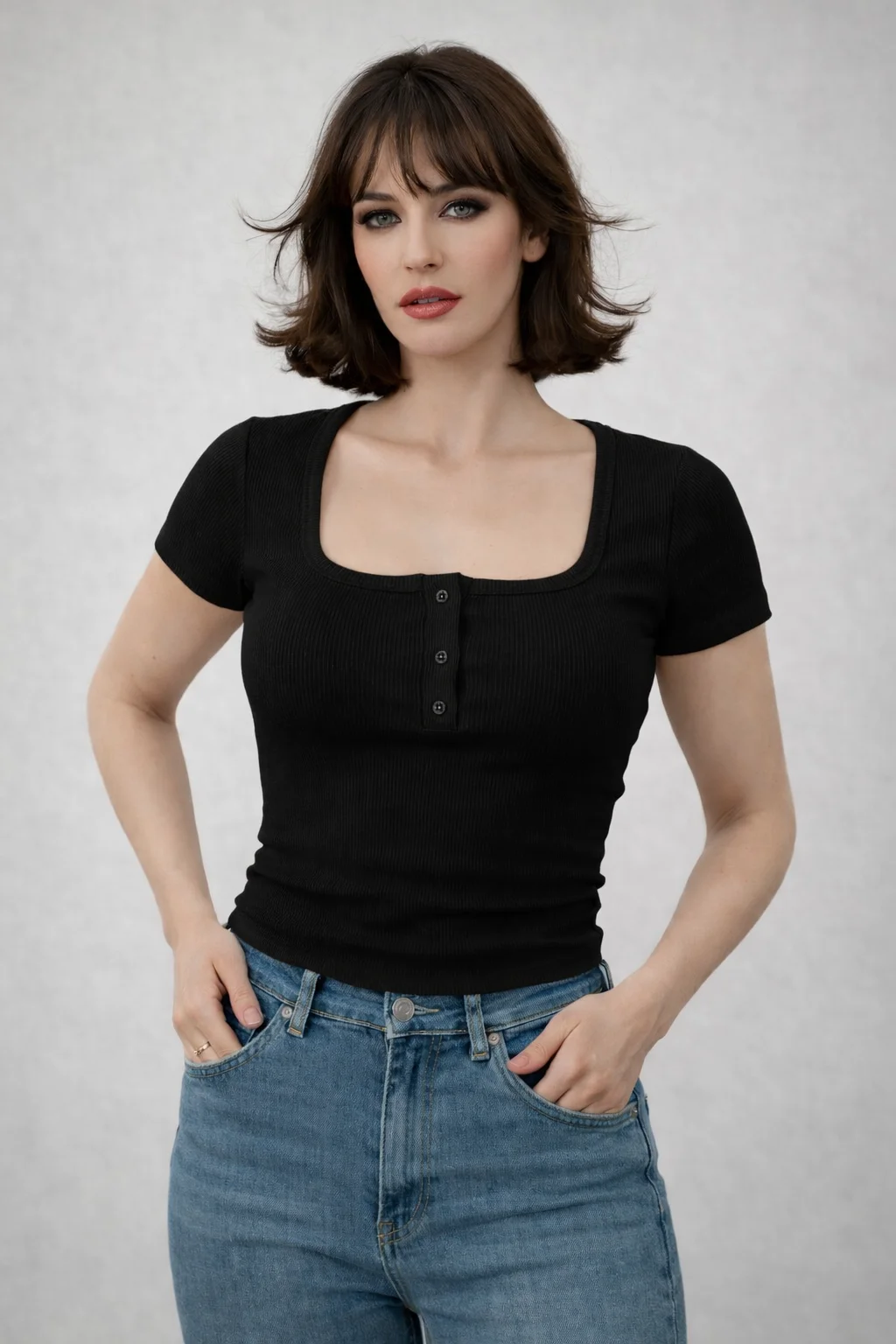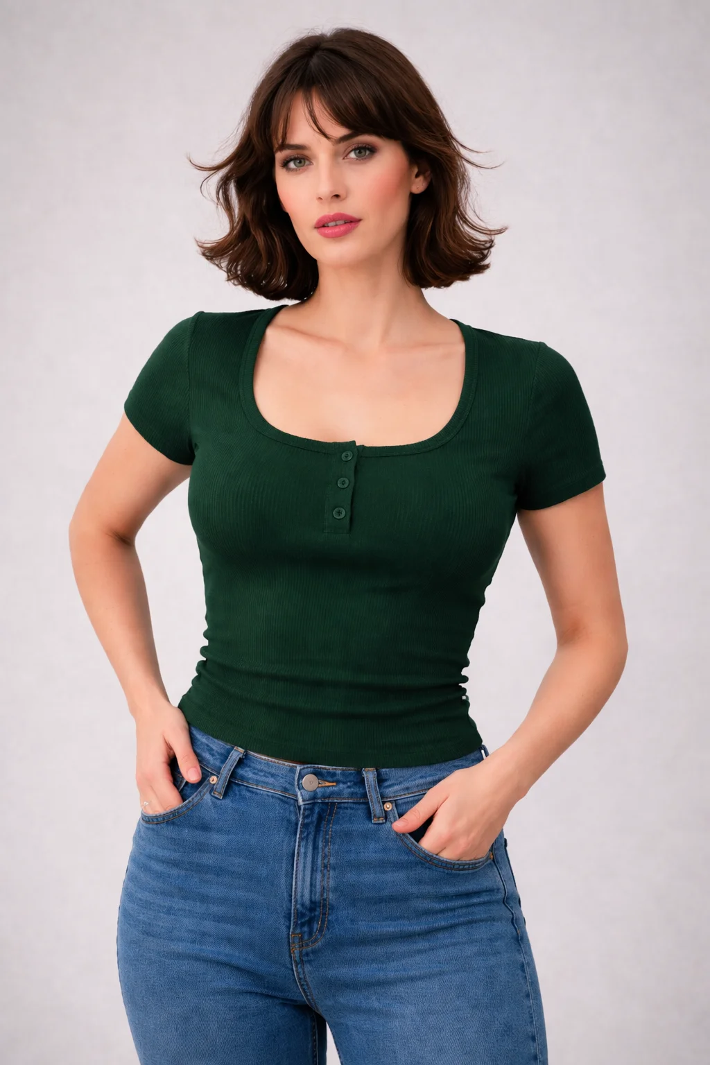 التصميم Slim Fit بيبرز شكل الجسم بشكل جذاب، مع ياقة مربعة وأزرار أمامية بتدي لمسة شيك وعصرية. التيشيرت مناسب للخروج اليومي، الجامعة، الشغل أو حتى لوك كاجوال ستايل.